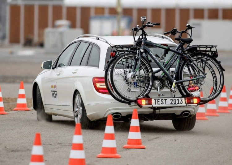 Beim Fahrtest mussten die Fahrradträger drei Prüfungen bewältigen: Ausweichen mit Tempo 50 in der Pylonengasse, volles Bremsen aus 80 km/h und das Überfahren einer Bodenwellenkombination bei Tempo 60.