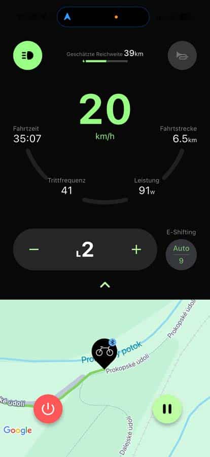 Dazu gehören neben der zurückgelegten Strecke, der Geschwindigkeit und dem Akkustand auch die Trittfrequenz, die eigene Leistung in Watt sowie der gewählte Gang und die gewählte Unterstützungsstufe.