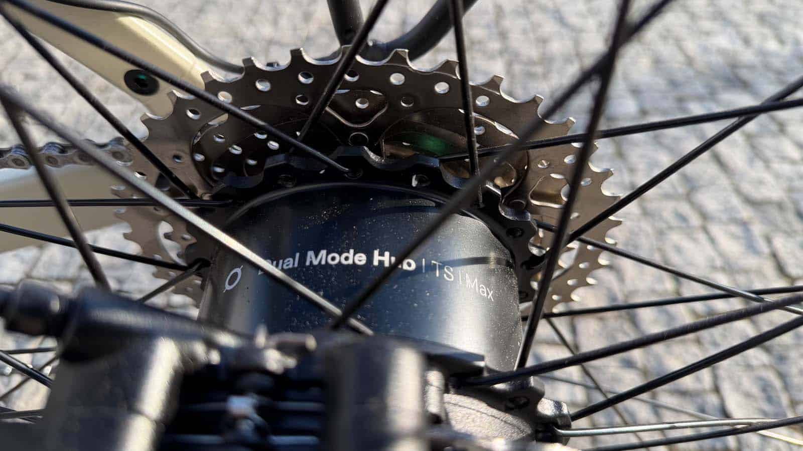 So kann das Lemmo One Collab.Ride samt Schaltung auch ohne Smartpac genutzt werden, nur eben ohne Motor. Dieser lässt sich mit einem Griff an der Hinterradnabe zwischen Muskelkraft und E-Power umschalten.