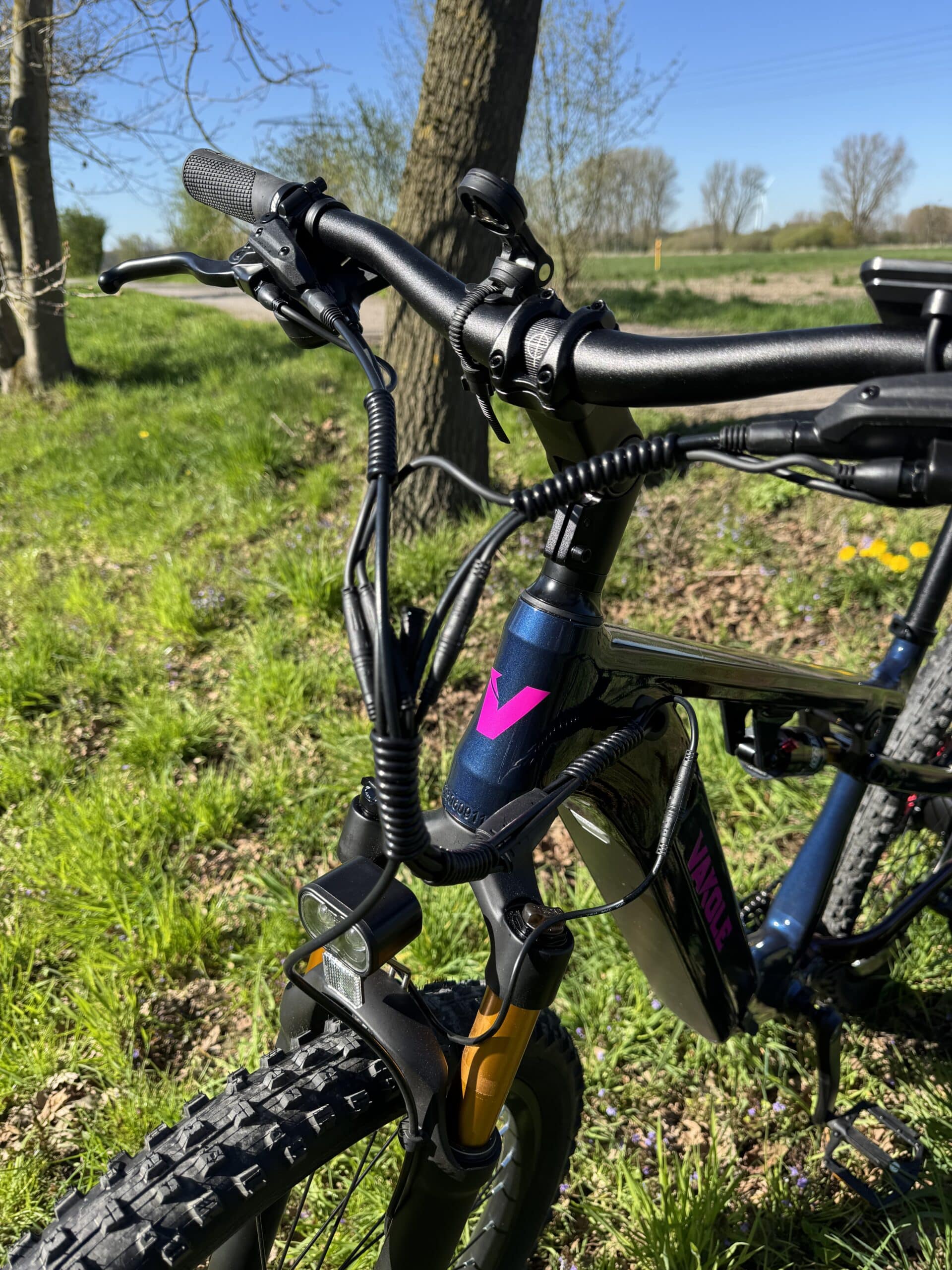 Schon beim Zusammenbau wirkt das E-Bike sauber gestaltet. Die Lackierung in Blau mit leicht violettem Einschlag sieht schick aus, der Rahmen ist sehr gut verarbeitet und die Shimano-Deore-12-fach-Schaltung springt einem sofort ins Auge. Das Vakole möchte offensichtlich nicht wie ein typisches Billig-Fully wirken. Die spannendere Frage ist aber, ob dieser Eindruck im Fahrtest trägt, oder ob sich später doch Schwächen herauskristallisieren.