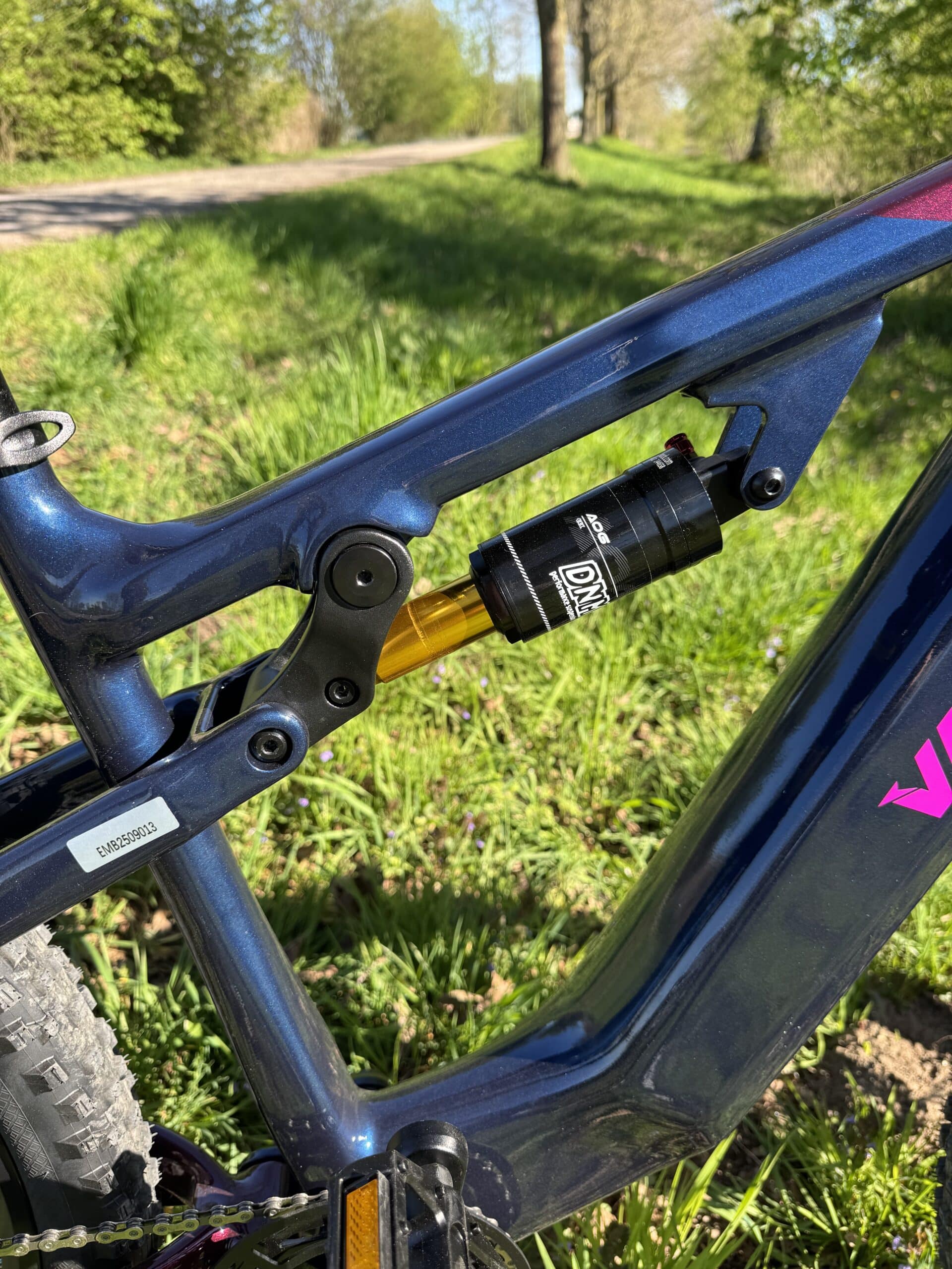 Beim Fahrwerk bleibt das Vakole ein typisches Preis-Leistungs-Bike – ohne das negativ zu werten. Hinten arbeitet ein DNM-Luftdämpfer (50 mm Federweg), vorne eine Federgabel mit 100 mm Federweg und Verspannung über eine Stahlfeder.