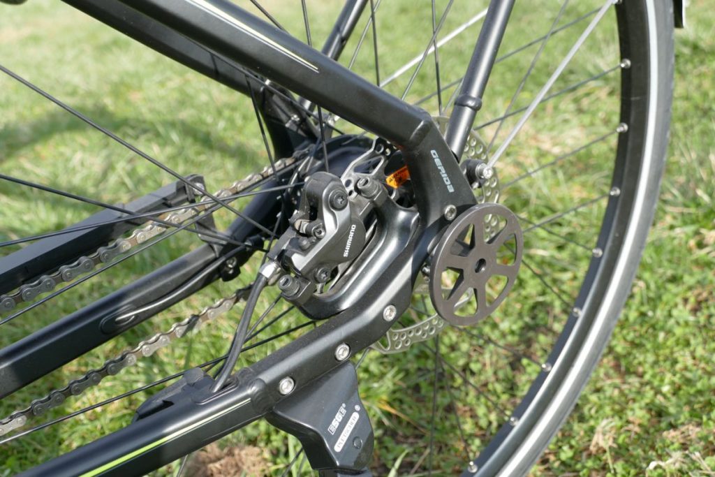 Selbst in brenzligen Situationen sorgt die Scheibenbremse von Shimano für einen präzisen Halt. Beide Griffe sind gut zu erreichen. Auch wenn die Finger während der Fahrt vom Hebel gelöst sind, lässt es sich leicht umgreifen.