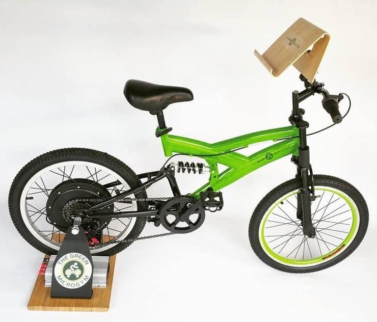 Die beiden neuen Erfindungen des Green Microgym Teams sind Multi-Funktions-e-Bikes. Auf der Straße bringen sie einen dank 350 Watt Motor am Hinterrad zügig voran. Abgestellt und an eine Batterie oder das heimische Stromnetz angeschlossen führen die Kurbelumdrehungen nicht zur Vorwärtsbewegung, sondern in abzapfbare Energie. Die 30 bis 100 Watt Leistung, die normal sportliche Menschen so aufbringen, reichen für den Betrieb kleiner Haushaltsgeräte oder können – nach Absprache mit dem Stromanbieter – ins Netz eingespeist werden.