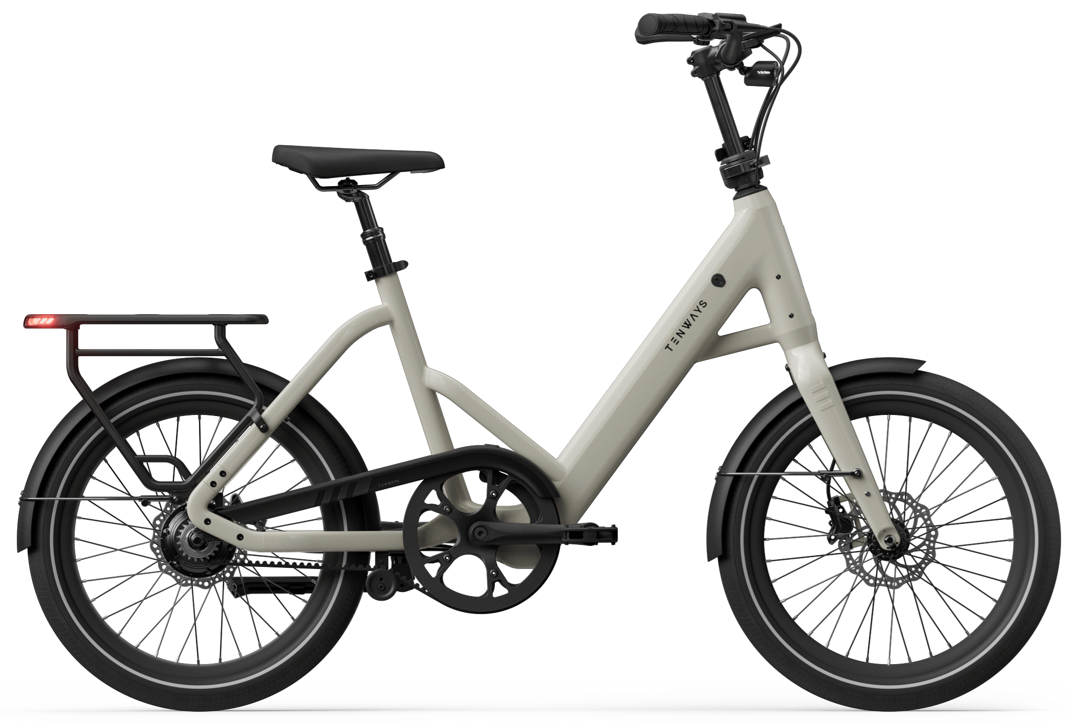 Dabei bleibt Tenways seiner bekannten und beliebten Designsprache treu. Klare Linien, integrierter Akku, möglichst verstaute Kabel. Hinzu kommt jetzt aber noch eine Geometrie mit tiefem Einstieg. Der höhenverstellbare Lenker und die gefederte Sattelstütze sollen auch dann für etwas mehr Komfort sorgen, wenn die Fahrt mal länger wird.