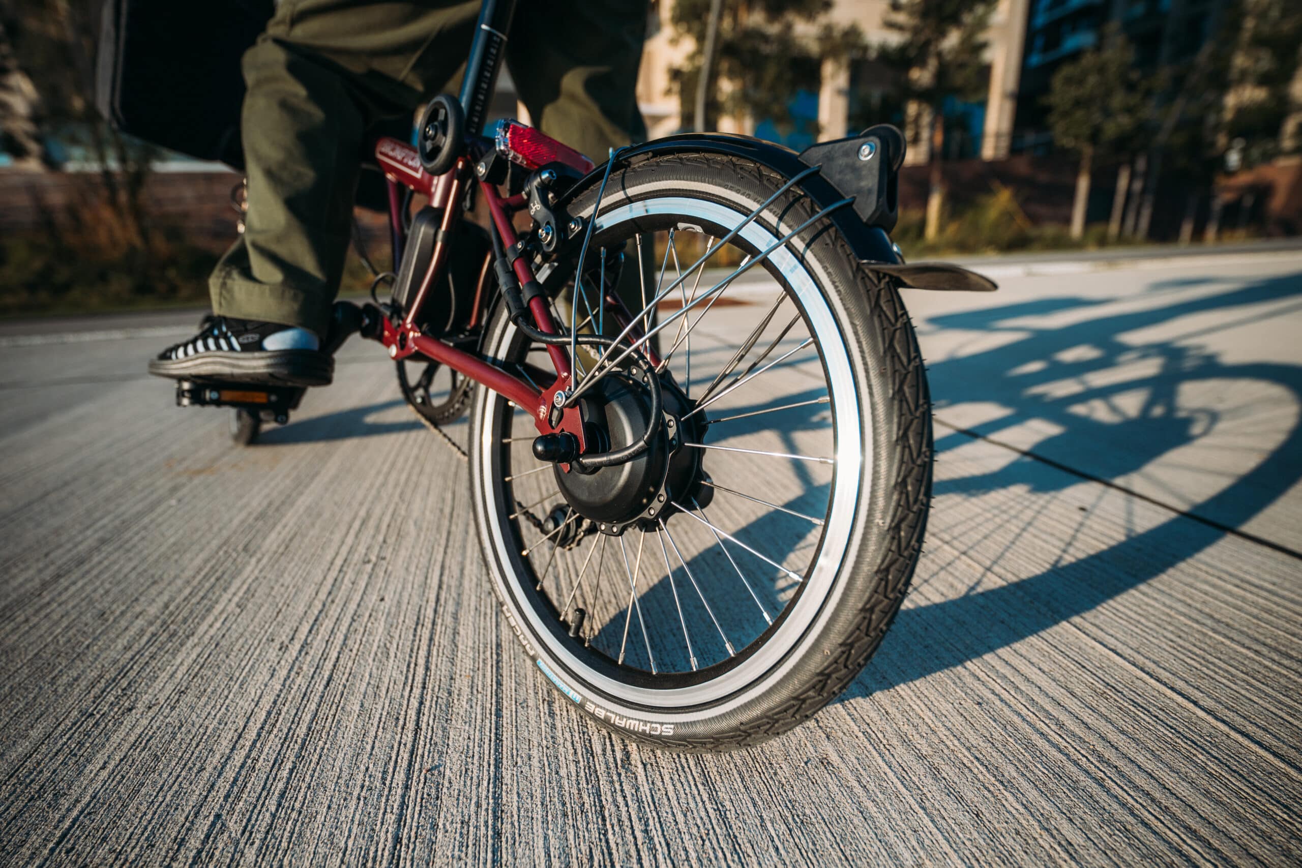 Anders als bei den meisten anderen Falträdern bleibt, einmal zusammengeklappt, jedes Fahrradteil an der vorgesehenen Stelle – ohne unbeabsichtigtes Ausklappen, sobald das Bike bewegt wird. Das Brompton Electrified C steht durch das SuperRoll+ System fest auf dem Boden und kann aufgrund der kleinen Faltmaße in fast jedem Kofferraum oder Gepäckfach verstaut werden.