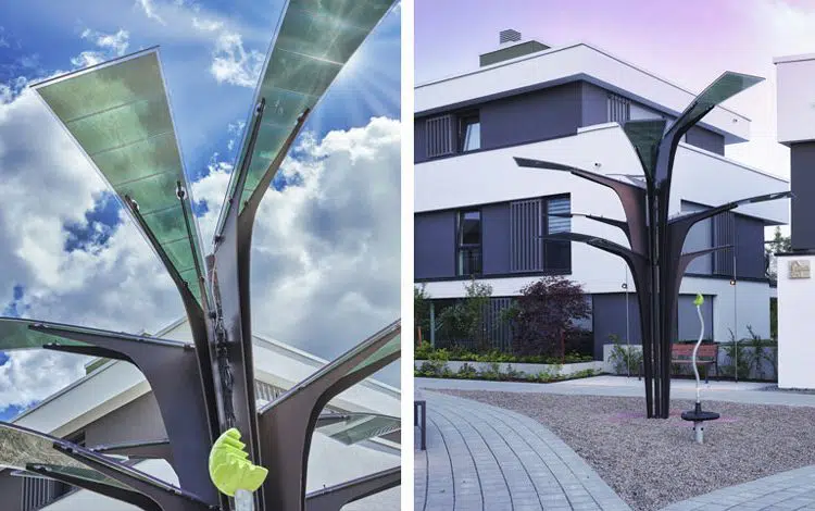 Der Solarbaum von Asca erinnert in seiner Form an einen klassischen Baum. Allerdings hat er an seinen „Ästen“ keine klassischen Blätter, sondern Solarzellen. Die Besonderheit sind die geschwungenen Solarmodule, die wie große Blätter wirken. Hierbei setzt Asca auf organische Solarzellen mit einer Polycarbonat-Laminierung. Diese werden in einem speziellen Verfahren auf dünne Folien gedruckt. Sie lassen sich neben der für den Solarbaum verwendeten grünen Farbe auch in Blau, Grau und Rot produzieren.