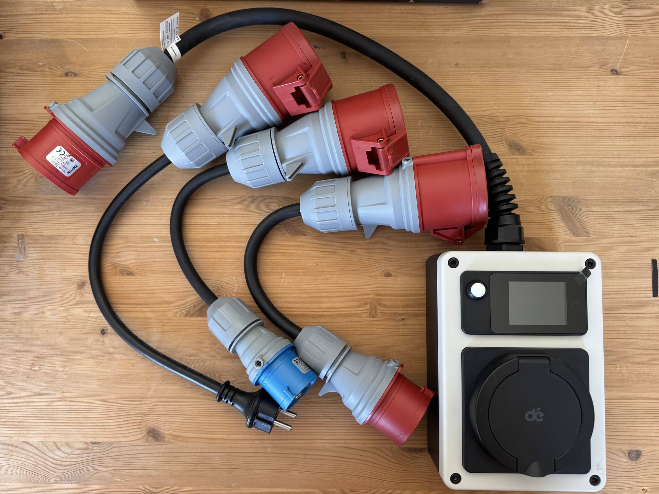 Wenn du das Set mit Adapterkabeln wählst, liegen außerdem noch Adapter für einen blauen CEE-Stecker (16 A), für Schuko und je nach Variante für CEE rot 16 oder 32 A im Paket.