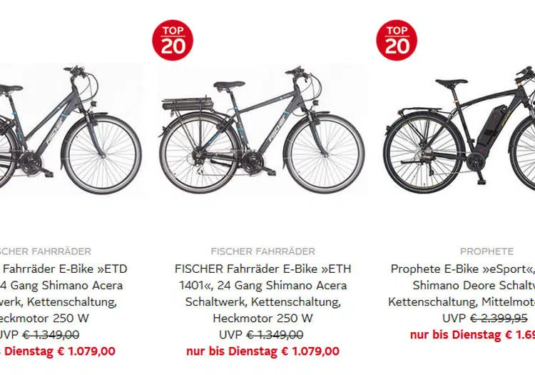 Zu den derzeit reduzierten E-Bikes bei otto.de zählen Modelle zahlreicher Markenhersteller. Unter anderem bekommst du dort das Entdecker e900 von Prophete für 1.099 Euro statt 1.399 Euro. Es bietet mit dem 493 Wh großen Akku und dem Blaupunkt Heckmotor mit 250 Watt eine Reichweite von bis zu 130 km. Ebenfalls gut für ausgiebige Fahrradtouren geeignet ist das Fischer ETH 1401 mit bis zu 140 km Reichweite sowie 24 Gang Shimano Acera Schaltwerk für 1.079 Euro statt 1.349 Euro.
