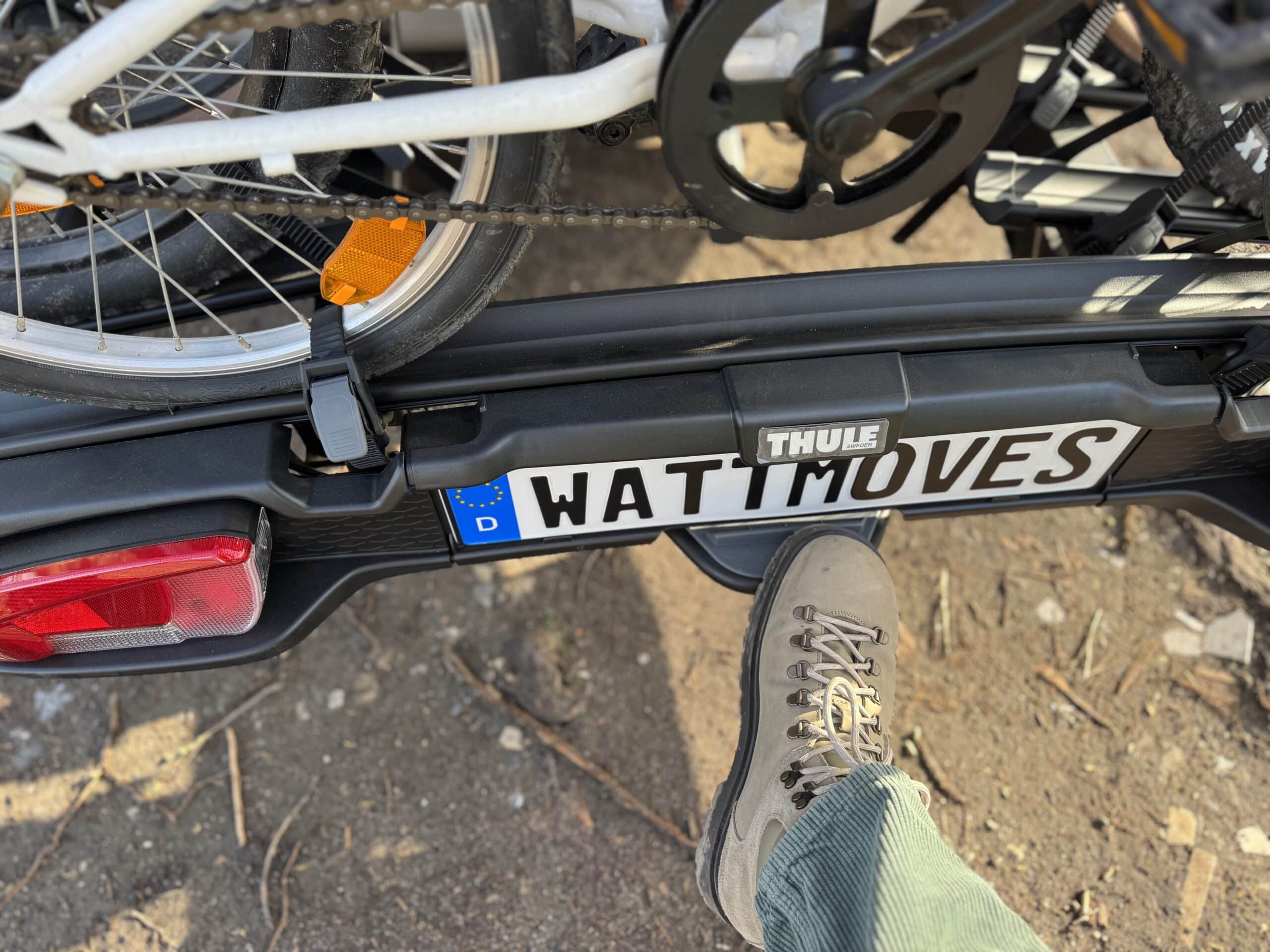 Ein guter Kupplungsträger muss nicht nur Fahrräder sicher transportieren, sondern sollte dem Auto im besten Fall nicht die Alltagstauglichkeit nehmen. An dieser Stelle sammelt der Thule im Test ebenfalls viele Pluspunkte. Der Kippmechanismus wird entspannt per Fußpedal ausgelöst und wirkt im Gegensatz zu manch anderen Lösungen nicht wie eine Notfunktion, sondern wie echter Mehrwert. Denn dadurch, dass man beim Abklappen beide Hände frei hat, um den Träger aufzufangen, wird das „mal eben kurz an den Kofferraum“ auch in der Praxis zum Kinderspiel.