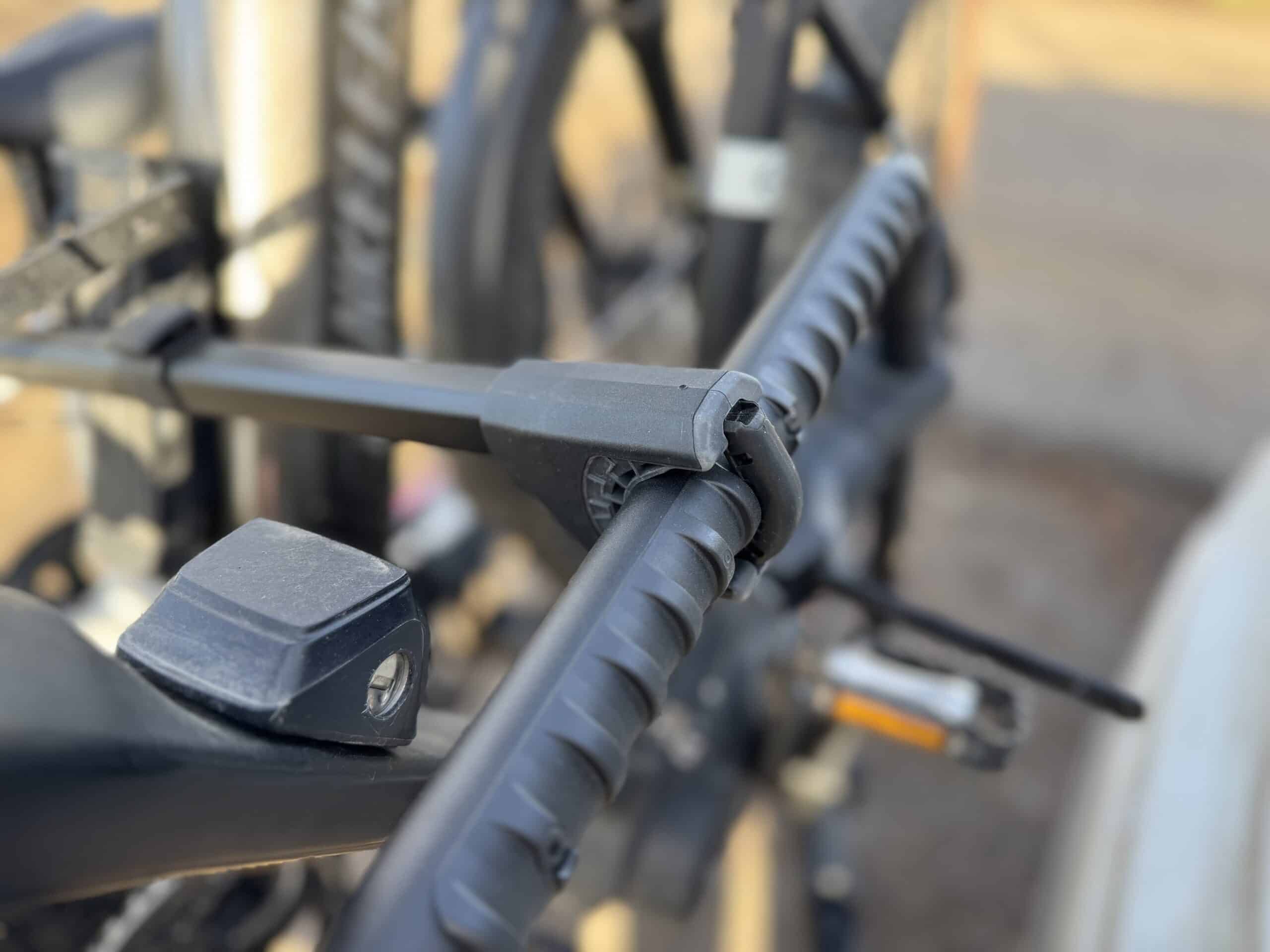 Noch besser gefallen hat mir das System der Haltearme. Statt umständlicher Rändelmuttern oder fummeliger Klemmungen kommt der VeloSpace 3 mit einer einfachen Druckknopf-Mechanik. Lösen, versetzen, wieder einrasten, festmachen. Das klingt unspektakulär, ist aber beinahe genial. Das System ist etwas schwer zu beschreiben, unser Testvideo zeigt deshalb die Funktion noch im Einsatz. Vor allem, wenn mehrere Räder mit unterschiedlichen Rahmenformen auf dem Träger stehen, ist diese Lösung Gold wert.