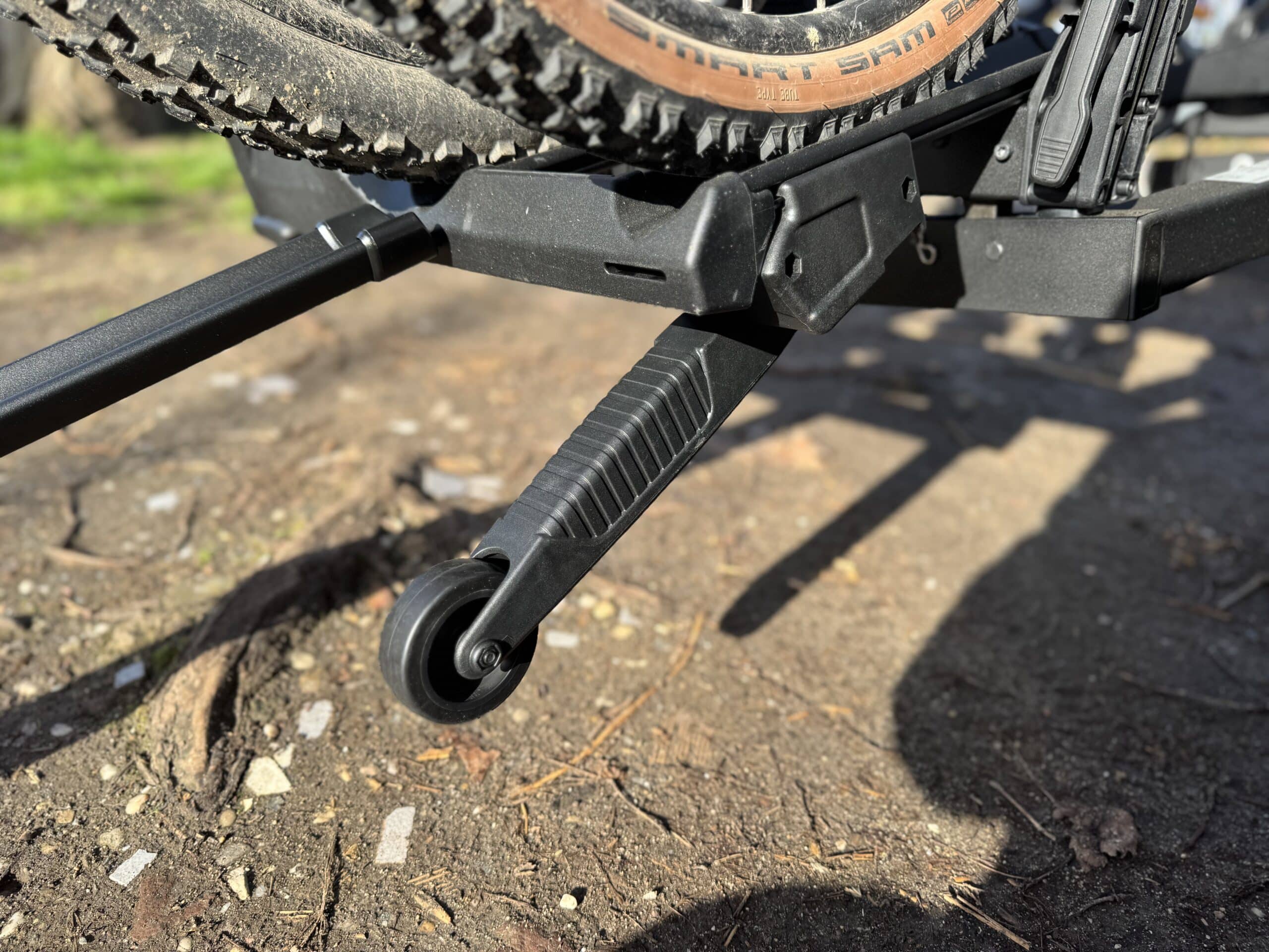 Ebenfalls nützlich ist das Thule Transport Wheel. Der Träger wiegt 21,1 kg und ist damit nicht absurd schwer, aber auch nichts, was man lässig unter dem Arm trägt. Das kleine Transportrad hilft deshalb beim Rangieren in Garage oder Hof spürbar. Während der Fahrt lässt sich das Rad bequem einklappen, sodass es nicht stört.