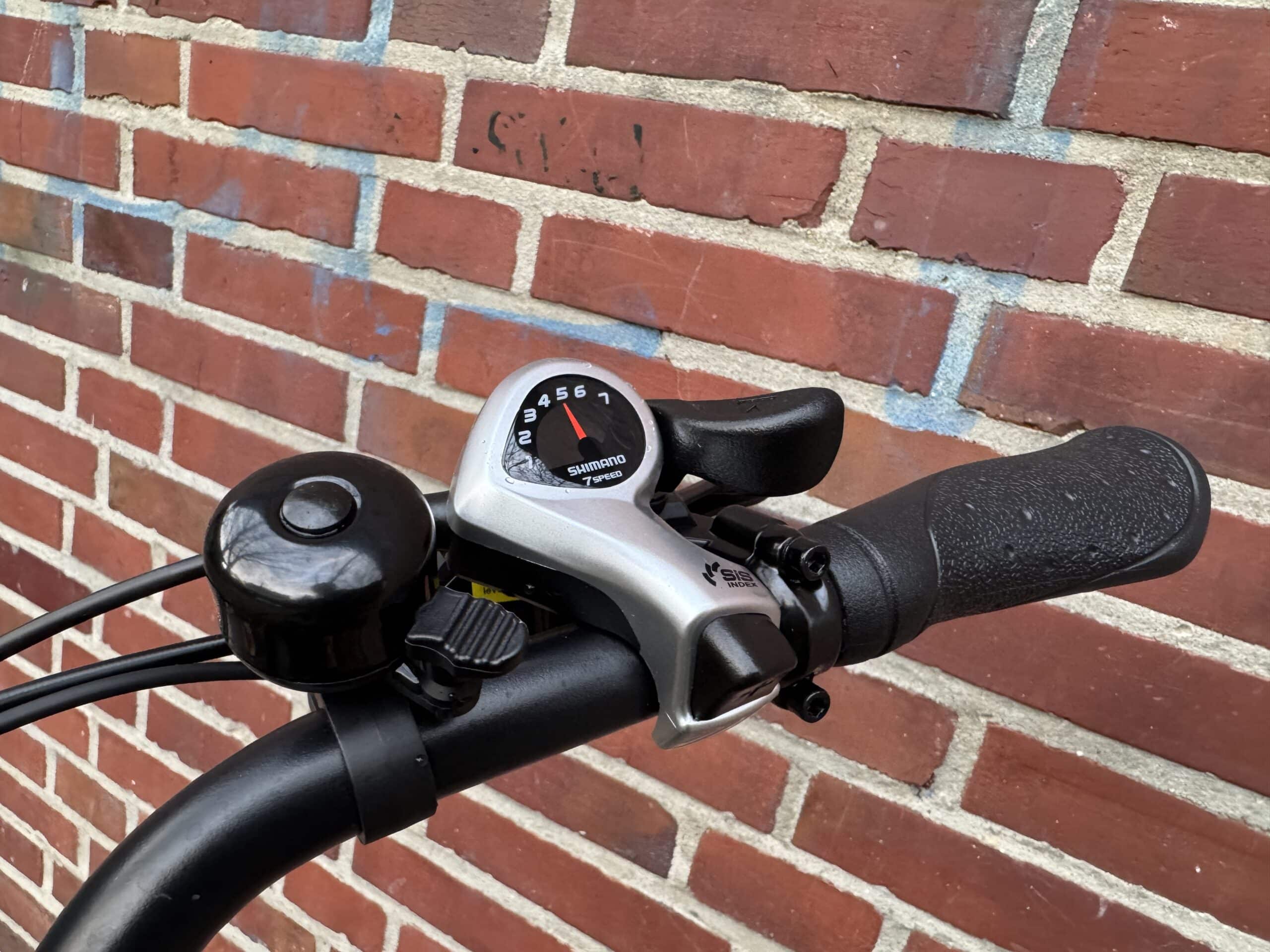 Die Gänge der Shimano-Einsteiger-Schaltung lassen sich gut durchschalten, der einfache Daumenhebel ist allerdings weniger direkt als bei Shiftern höherer Qualität. Für Gelegenheitsausflüge kein Problem, bei längeren Touren würde mich der wenig performante Schalthebel stören. Die Bremsen packen kräftig zu und geben ein sicheres Gefühl im Stadtverkehr.