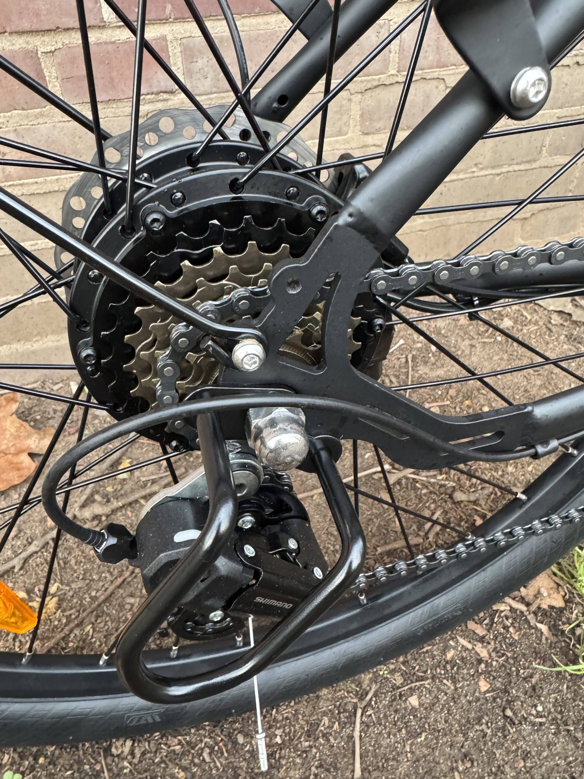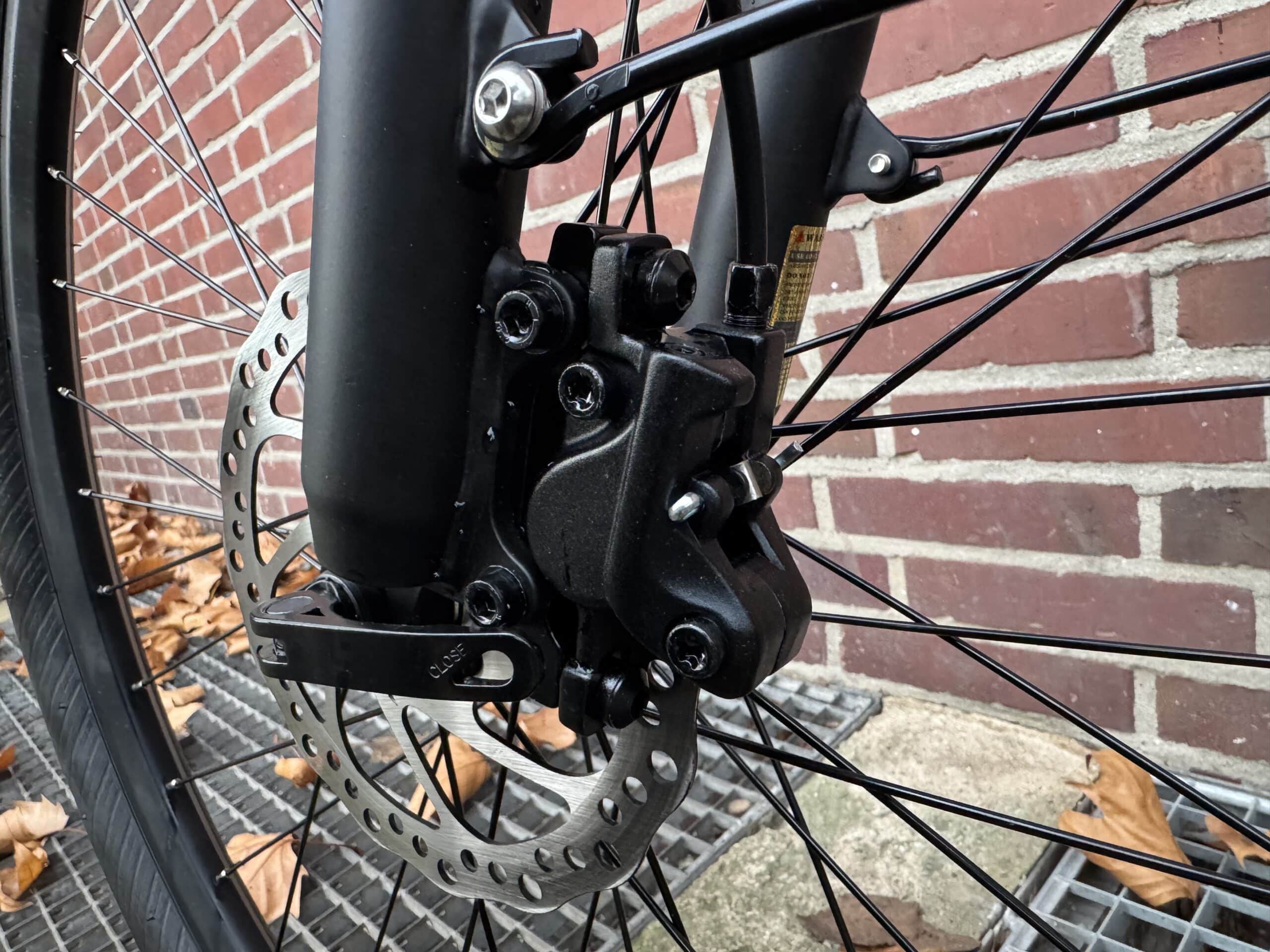 Geschaltet wird über eine Shimano 7-Gang-Kettenschaltung, die eine solide Übersetzungsbandbreite für Stadtverkehr und moderate Anstiege bietet. Gebremst wird mit hydraulischen Scheibenbremsen vorne und hinten, was gleichzeitig auch der relevante Unterschied zum Standardmodell J1 darstellt. Hier wurden nämlich mechanische statt hydraulische Bremsen verbaut.