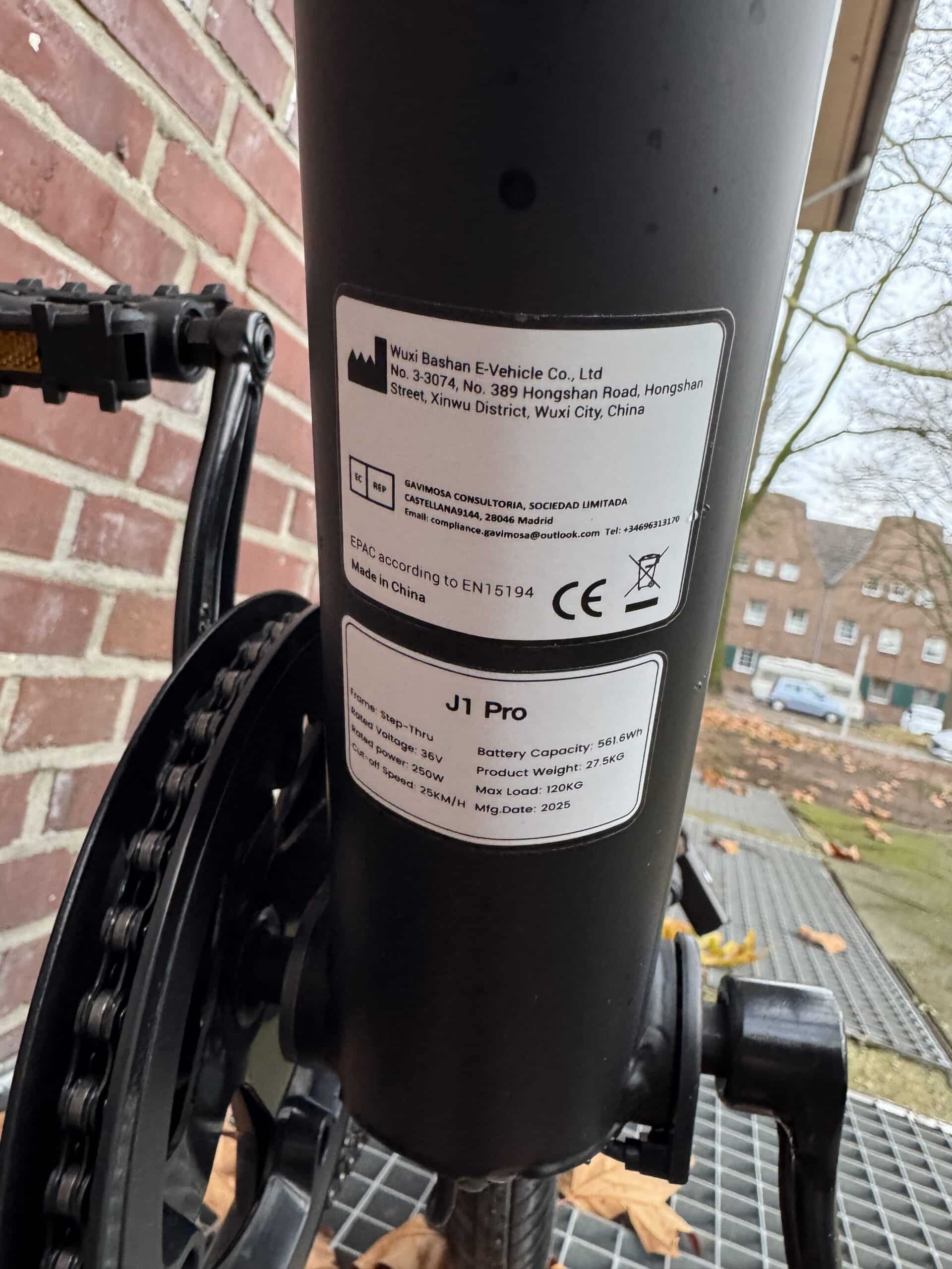 Das Bike ist auf 27,5-Zoll-Reifen unterwegs. Zur serienmäßigen Ausstattung gehören Schutzbleche, ein Seitenständer sowie eine fest installierte Beleuchtungsanlage für den Einsatz im Straßenverkehr. Positiv außerdem: Das Touroll J1 Pro besitzt eine ordentliche Kennzeichnung mit CE-Aufkleber, die bei sehr günstigen China-E-Bikes häufiger fehlt.