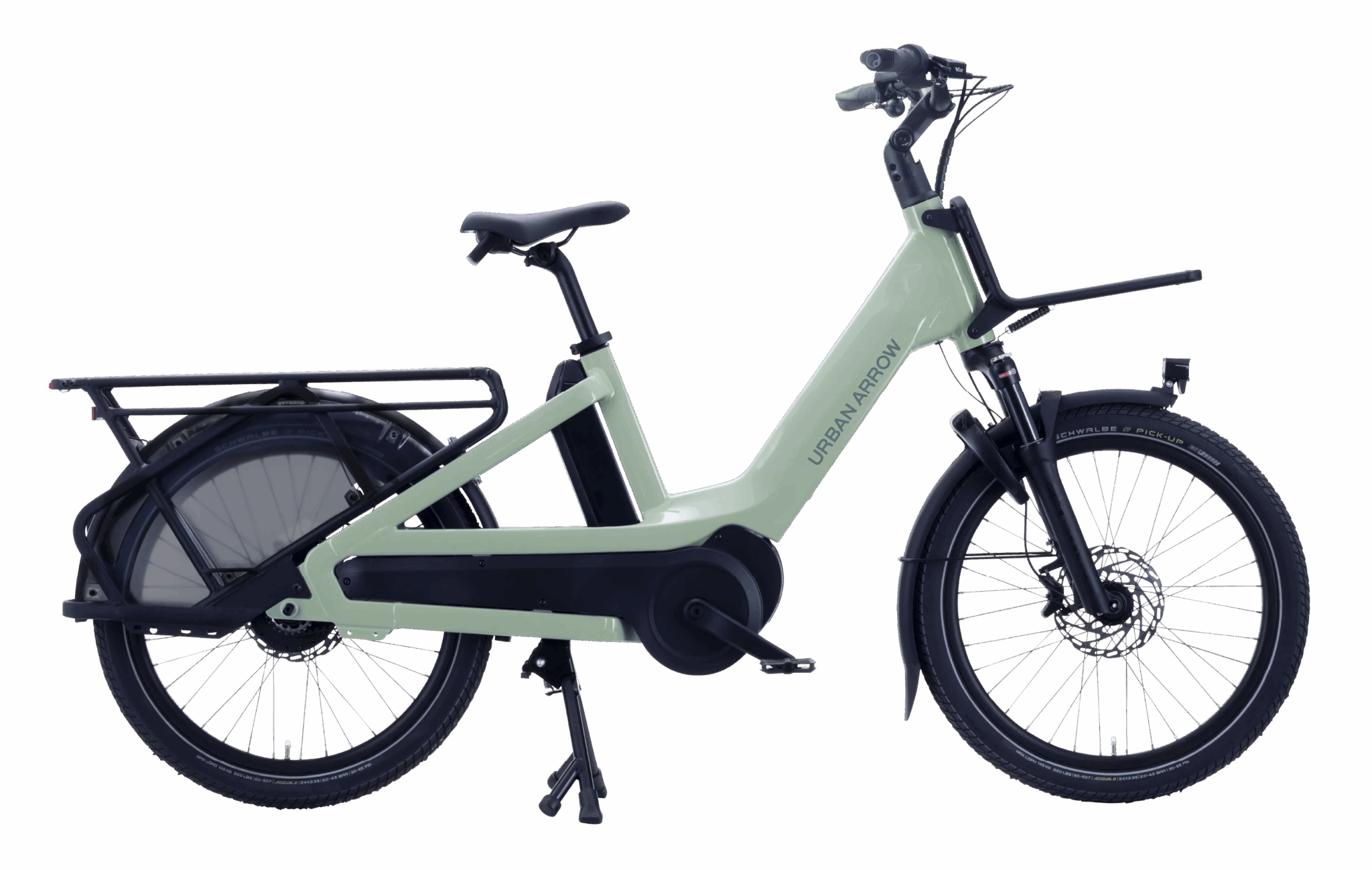 Vorne wartet das Breeze mit einer weiteren Ladefläche auf, die allerdings deutlich kompakter ist als bei den bisherigen E-Cargos von Urban Arrow. Auch hier lässt sich dank MIK-System werkzeuglos verschiedenes Zubehör als Transporthilfe anbringen. So transportiert der elektrische Lastenesel bis zu 200 kg (inklusive Fahrer), wobei das E-Bike in der Basisversion selbst rund 35 kg auf die Waage bringt. Der Heckträger allein trägt bis zu 80 kg, der Frontträger bis zu 15 kg.