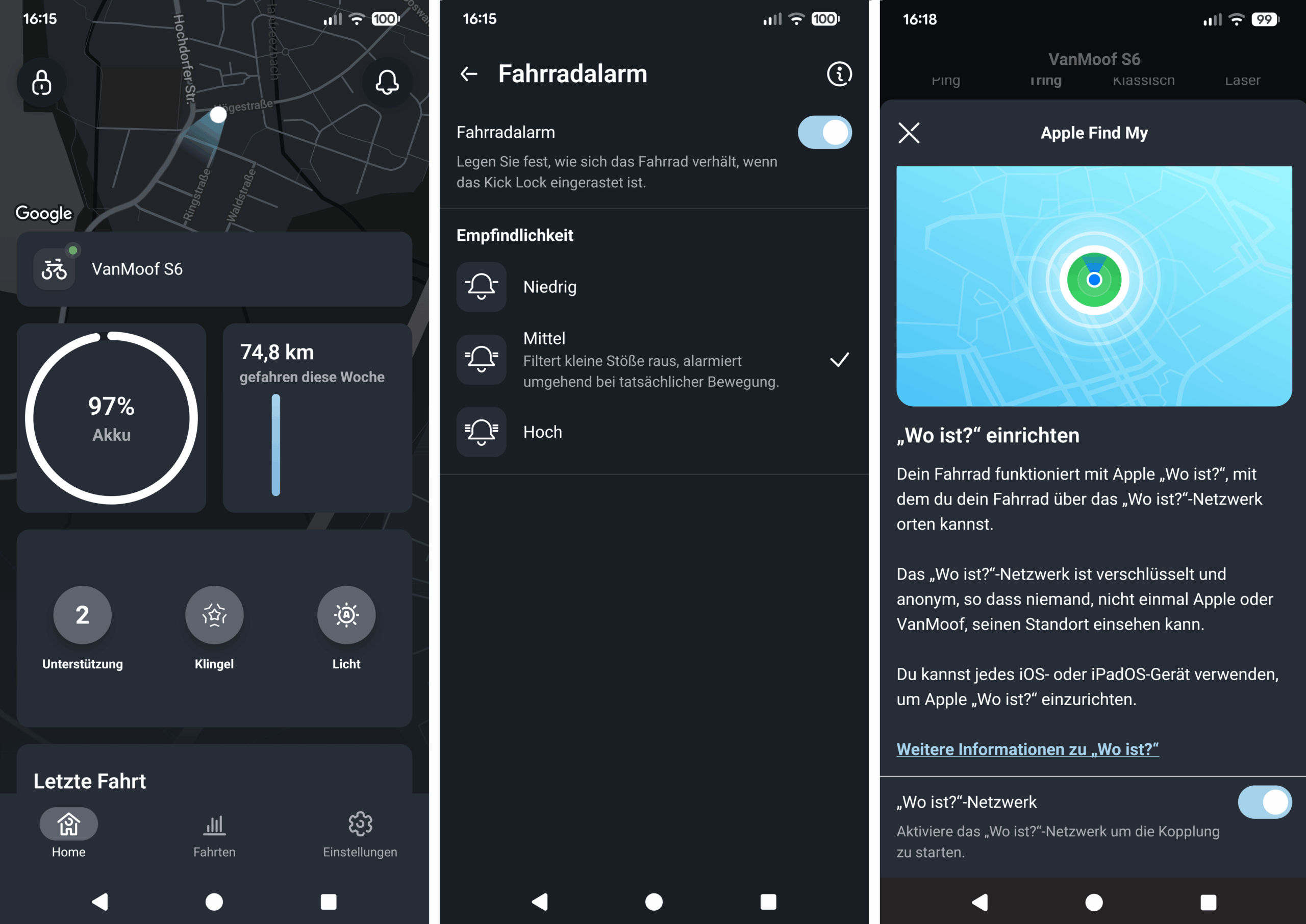 Bei der Ortung eines gestohlenen S6 hilft Apples „Find My“-Netzwerk. Das E-Bike lässt sich per Bluetooth in die „Wo ist?“-App einbinden und erscheint dort auf der Karte. Zur exakten Lokalisierung ist über die App eine Klingel am E-Bike abspielbar. Die Features funktionieren unabhängig von der VanMoof-App.