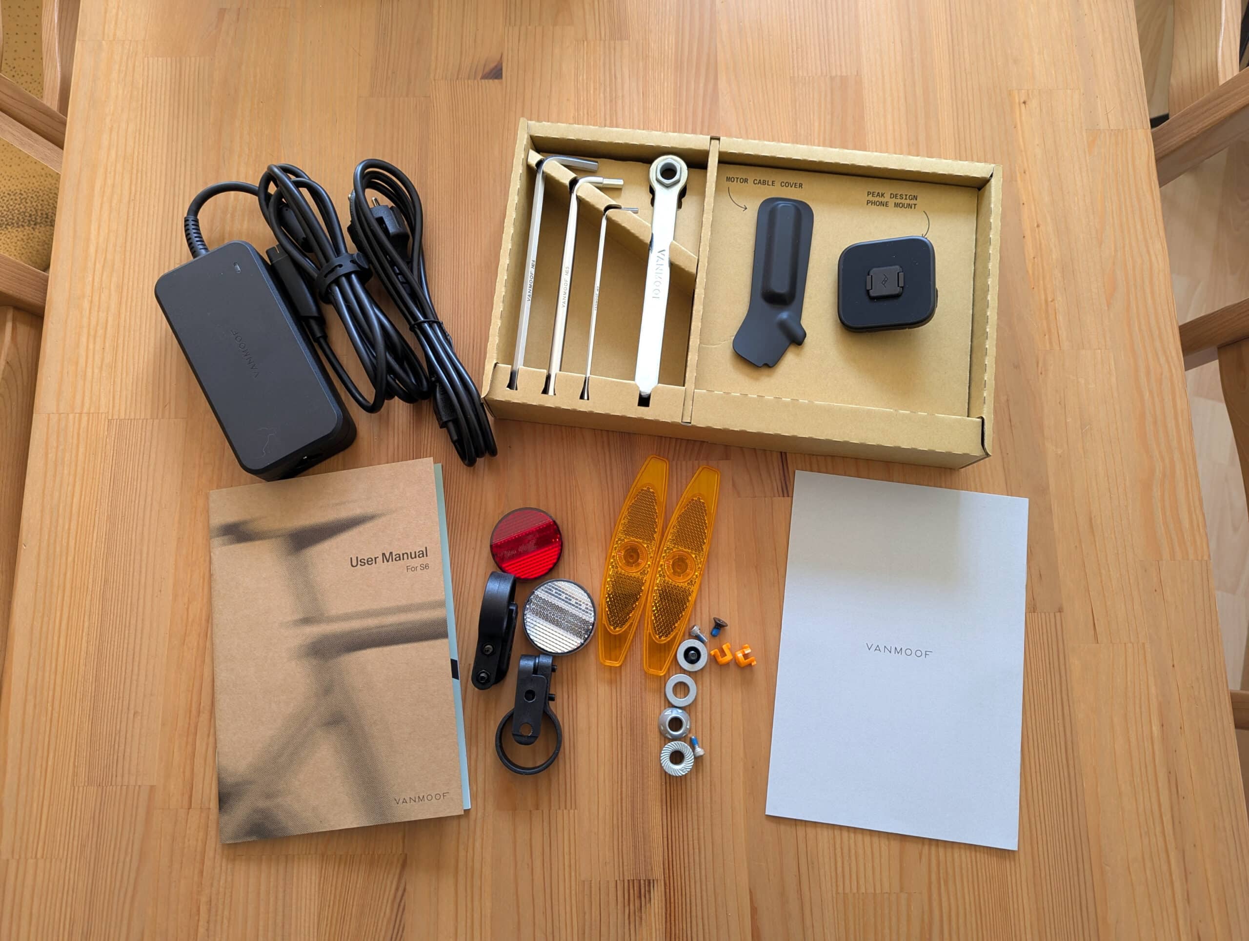 Beim S6 setzt VanMoof erneut auf ein klares, sehr aufgeräumtes Gesamtbild. Das E-Bike kommt zum Test weitgehend vormontiert an, der Aufbau gelingt zügig. Die perfekt bebilderte deutsche Anleitung führt nachvollziehbar durch die letzten Schritte: Vorderrad einsetzen, Motorkabel verbinden (etwas friemelig), Lenker ausrichten, Pedale montieren. Dann steht das Rad fahrbereit da.