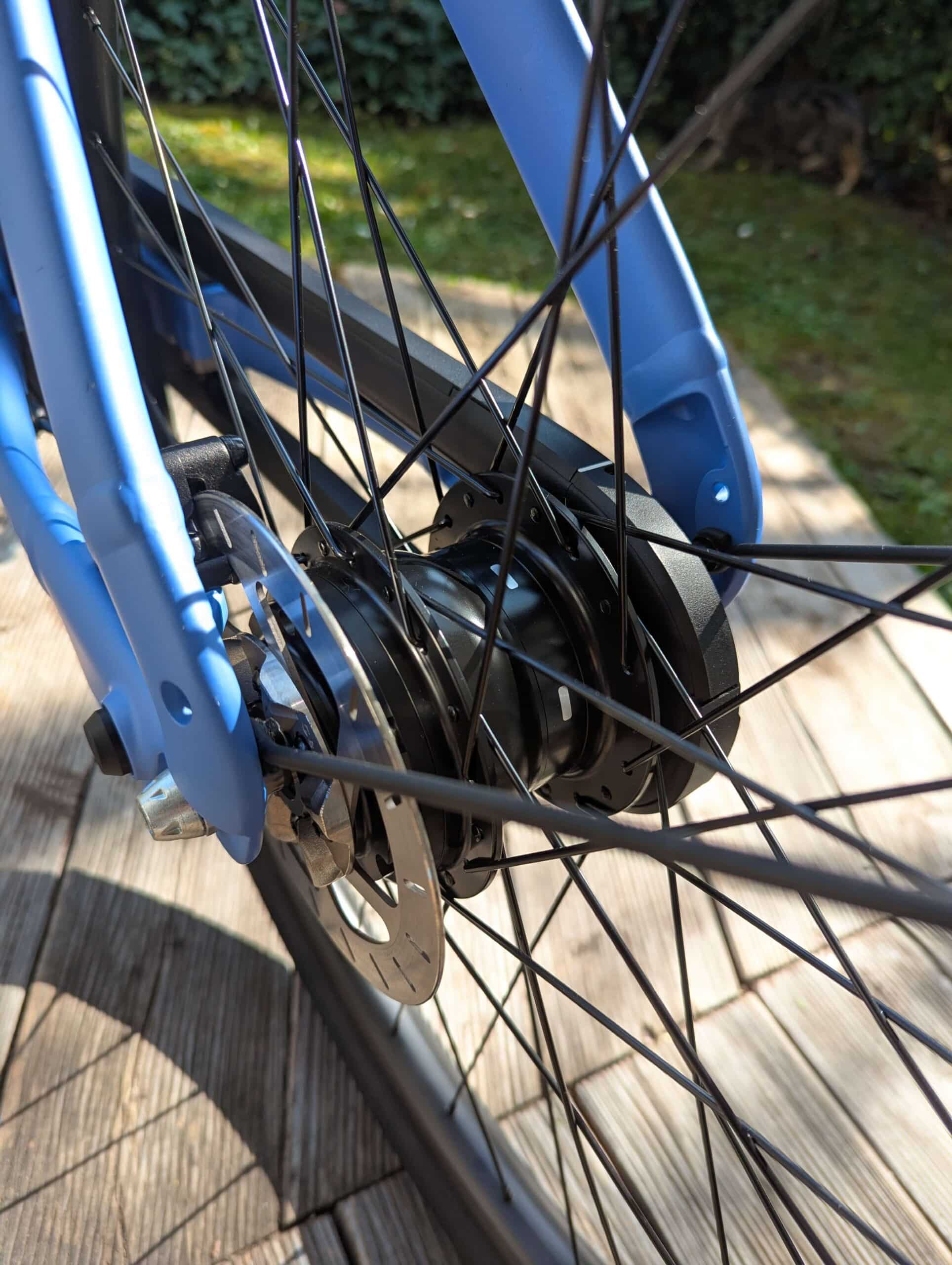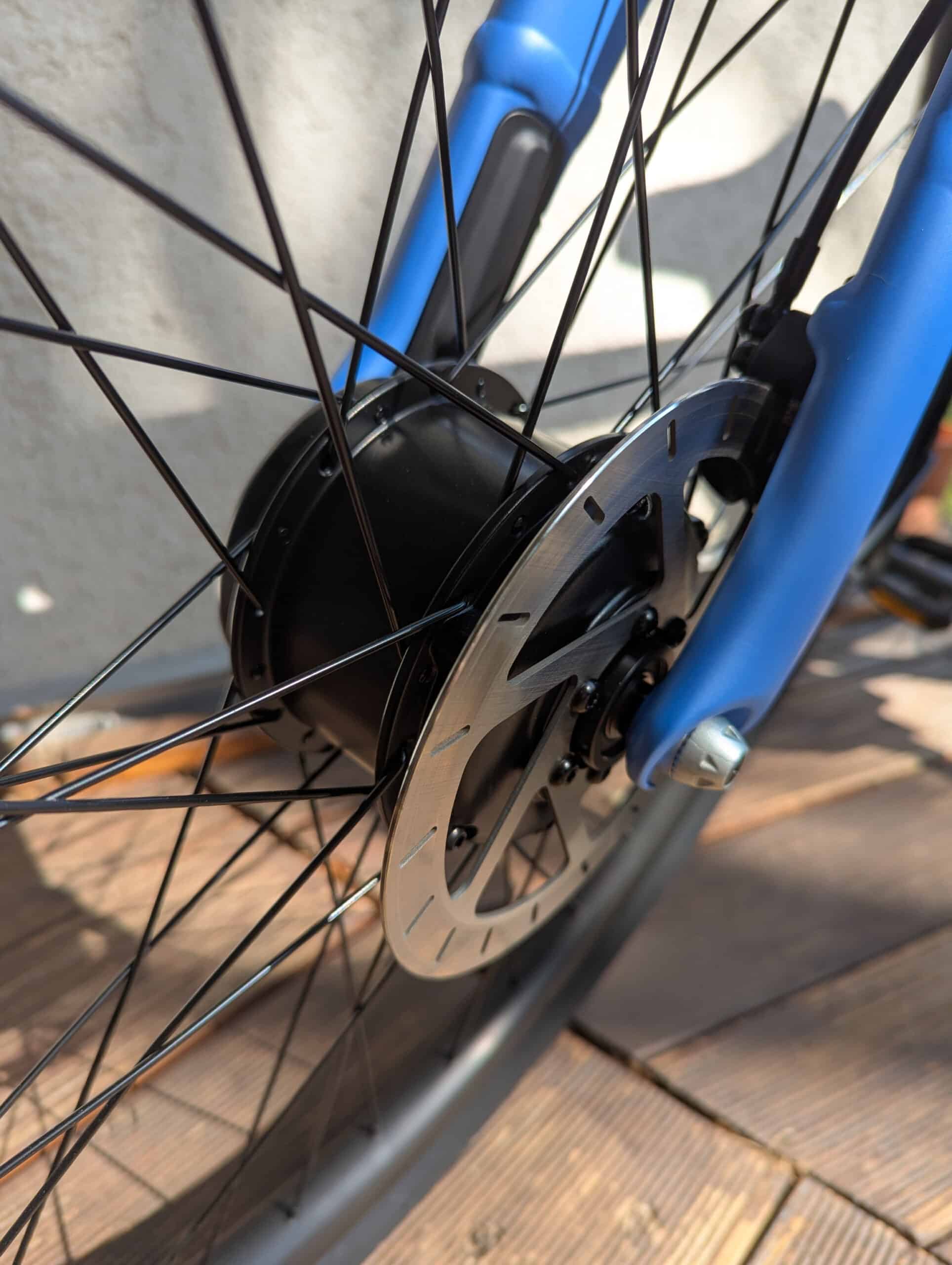 Positiv fällt auch der heutzutage eher ungewöhnliche Vorderradmotor auf. Trotz anfänglicher Skepsis überzeugt er dann doch mit gleichmäßiger Kraftentfaltung und hoher Traktion. Auch bei höheren Unterstützungsstufen bleibt das Fahrverhalten stabil. Der Motor arbeitet insgesamt leise, aber nicht lautlos. Geräusche sind im Stadtlärm dennoch im Grunde nicht wahrnehmbar.