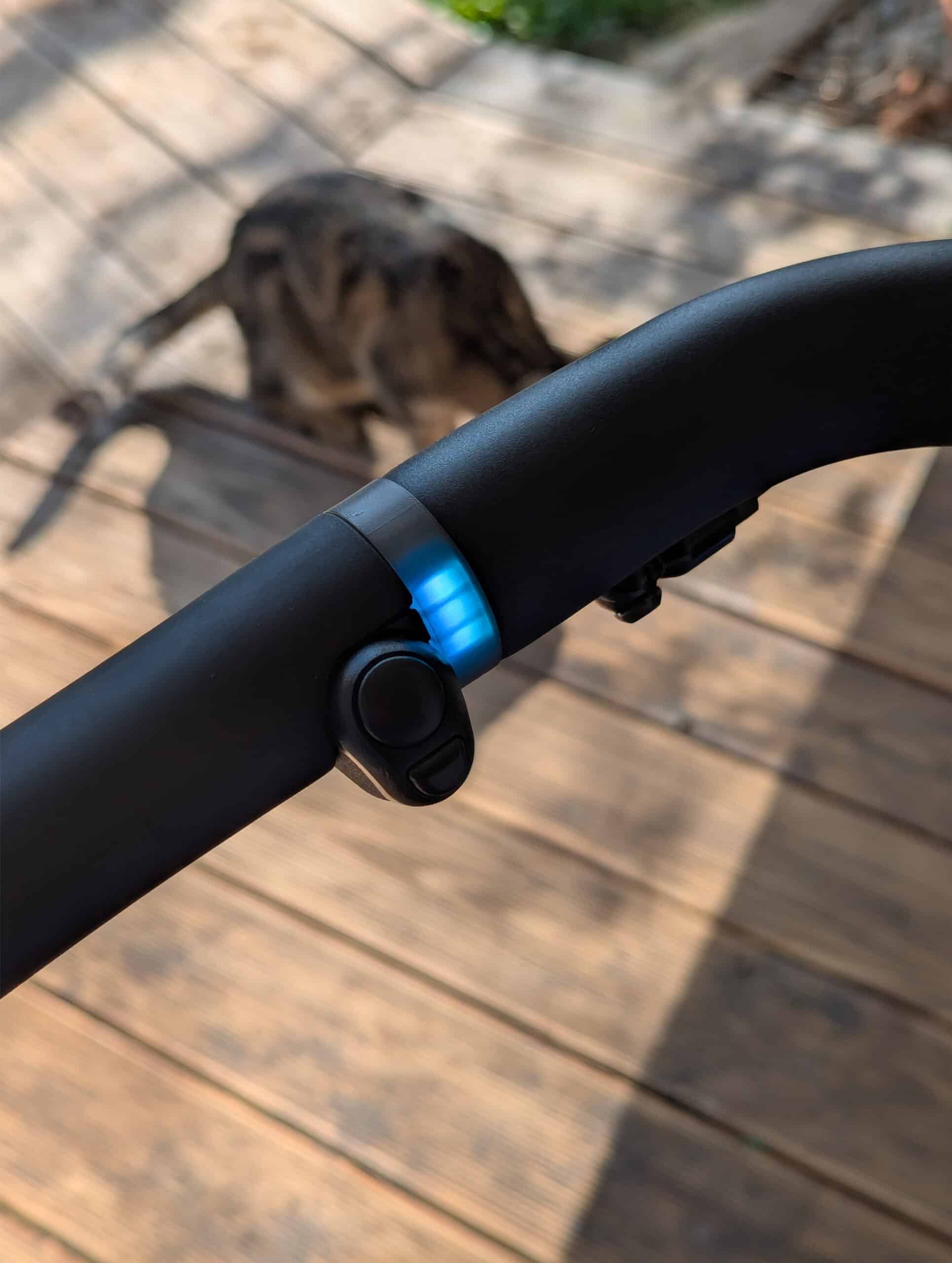 Die LED-Lichtringe im Lenkerbereich nennt der Hersteller Halo-Light-System. Es ersetzt ein herkömmliches Display vollständig und zeigt dennoch Akkustand, Unterstützungsstufe und Geschwindigkeit grafisch an. Links ist der Akkustand visualisiert, rechts je nach Modus entweder die aktuelle Geschwindigkeit oder die gewählte Unterstützungsstufe. Die Anzeige ist gut ablesbar, erfordert aber eine gewisse Eingewöhnung.